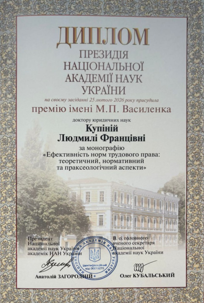 Премію присуджено за монографію «Ефективність норм трудового права: теоретичний, нормативний та праксеологічний аспекти».